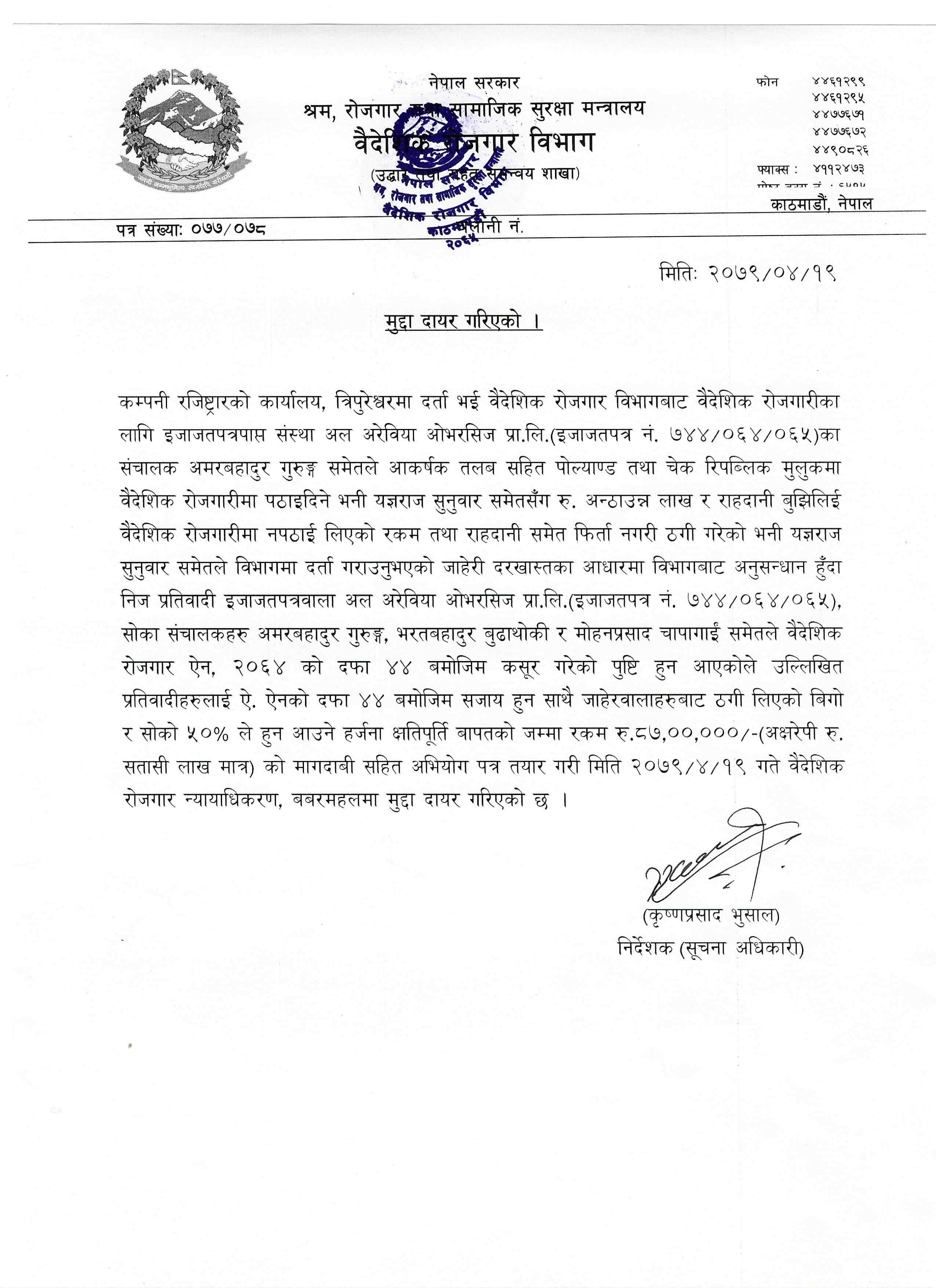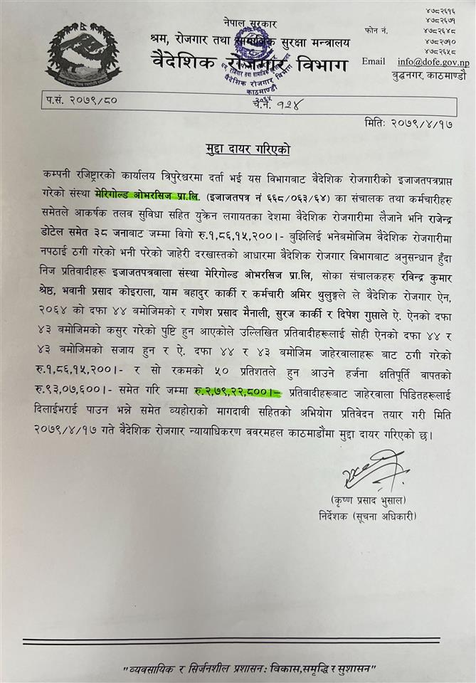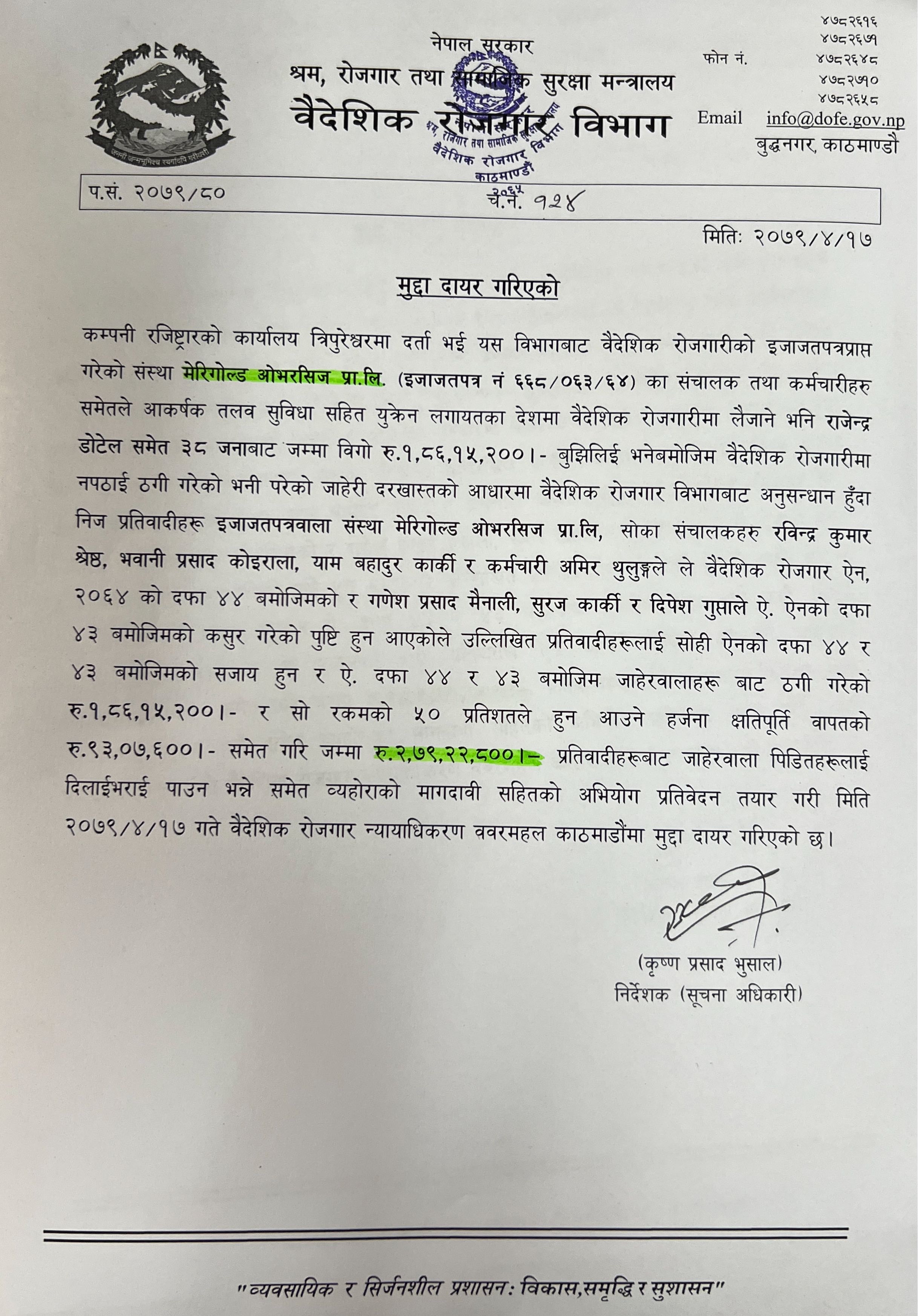 कपिराइट © २०२४– श्रम रोजगार तथा सामाजिक सुरक्षा मन्त्रालय, वैदेशिक रोजगार विभागको सर्वाधिकार सुरक्षित